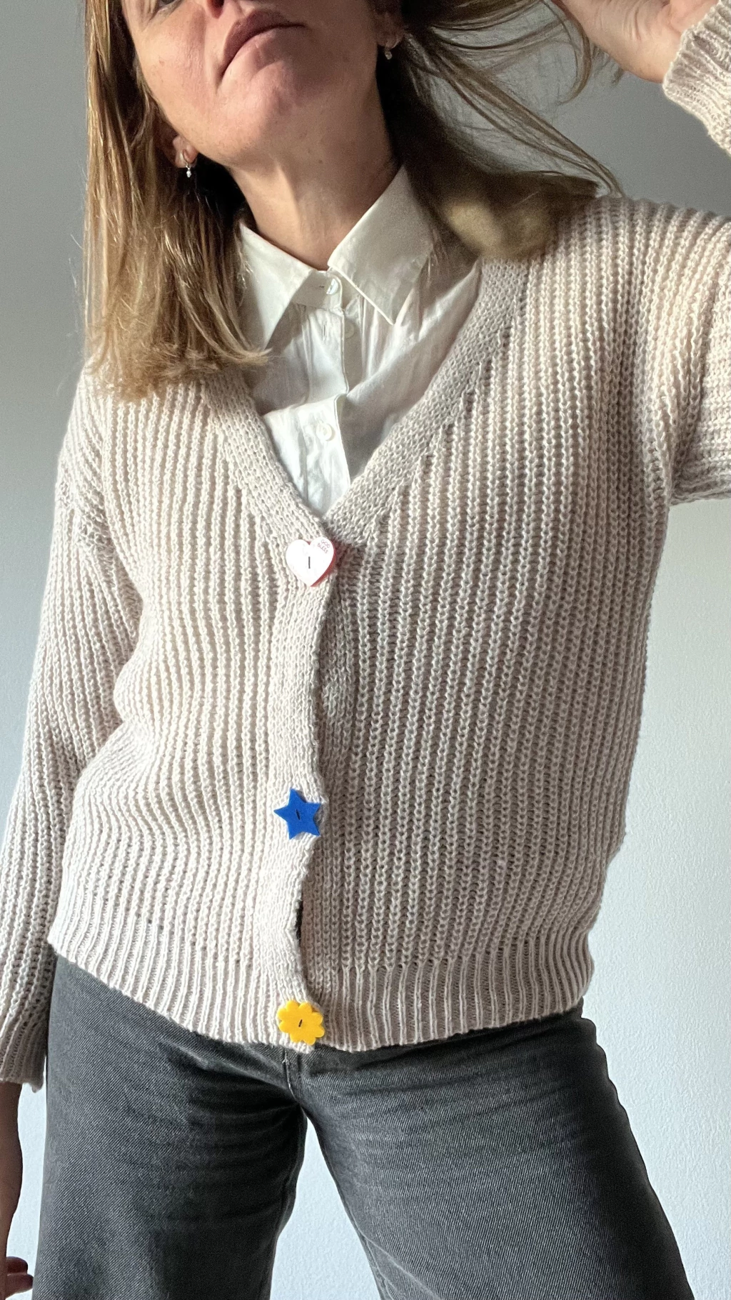 Su detalle estrella: tres botones acrílicos de colores primarios, todos distintos y únicos: