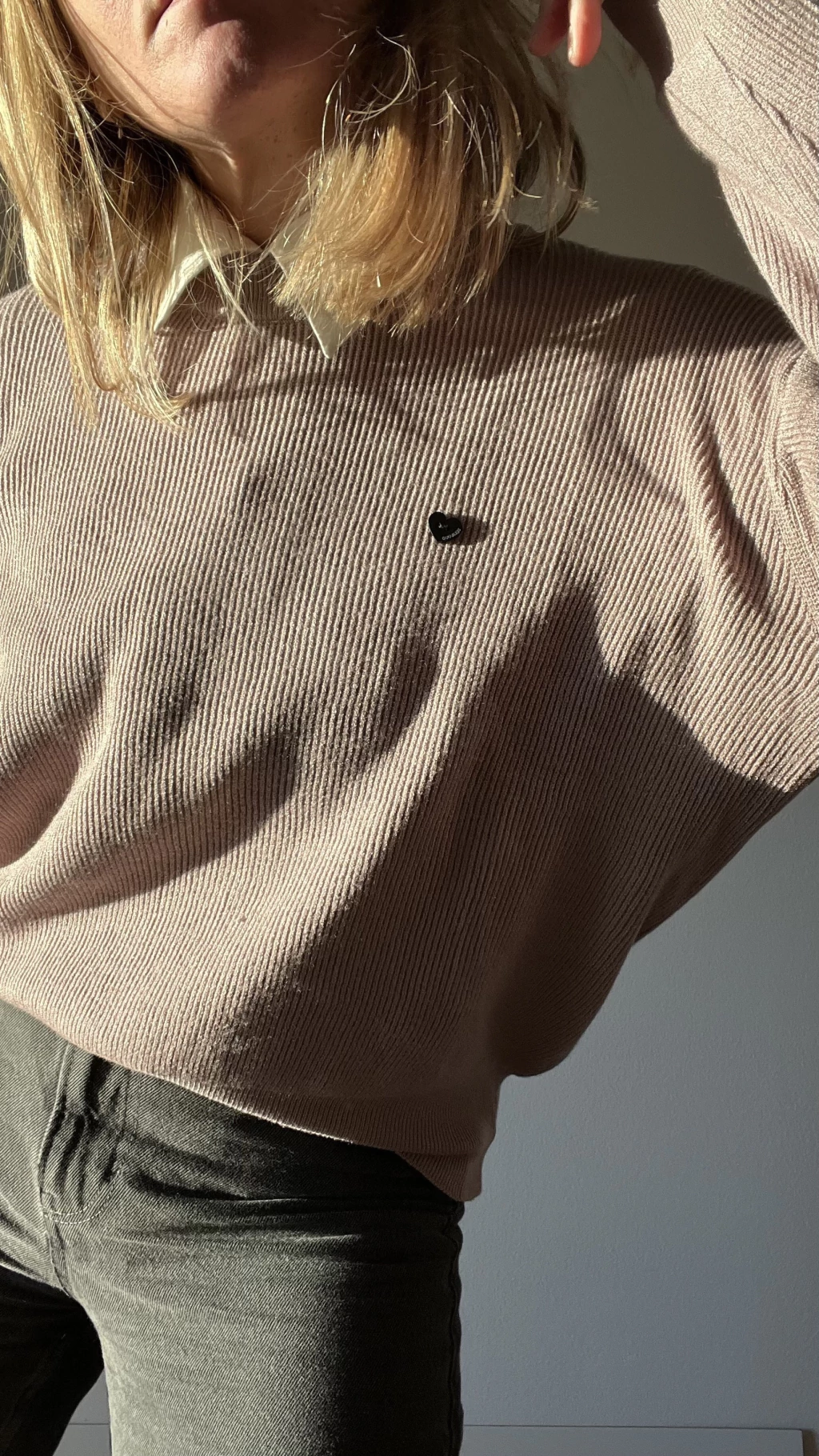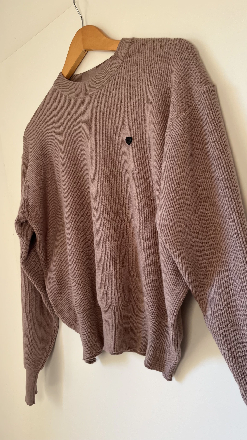 Tiene una textura acanalada tipo morley, que lo hace más elástico y estructurado, y un calce relajado con manga murciélago que favorece un montón.